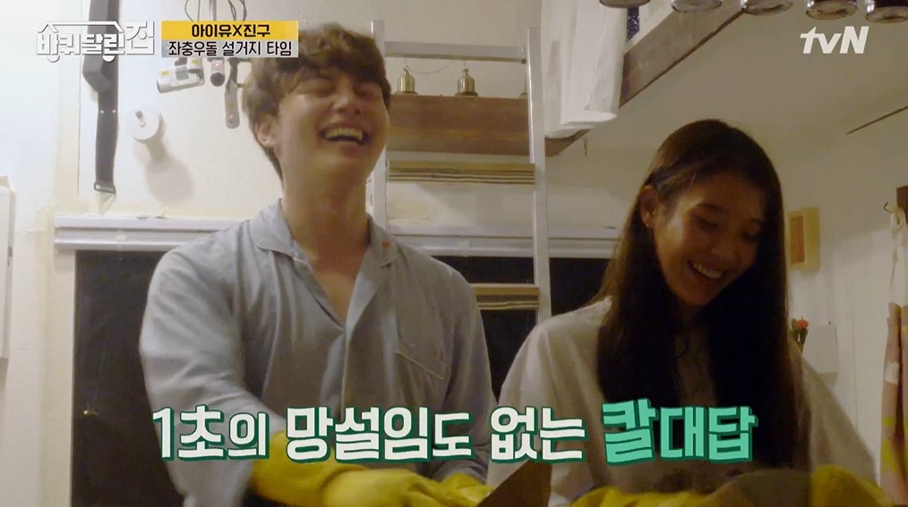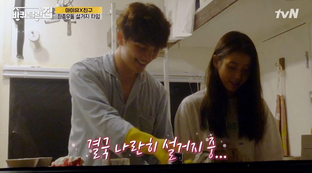 가수 겸 배우 아이유가 함께 드라마에서 호흡을 맞춘 배우 여진구와 다시 예능에서 만나 설렘 가득한 분위기를 연출했다.