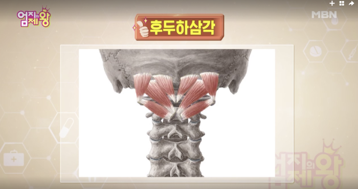 바로 ‘후두하삼각근’을 지압해주는 것이다. 후두하삼각근은 목뼈 양옆 움푹 들어간 부위이다. 그 부위를 15~20초간 눌러 지압한다.