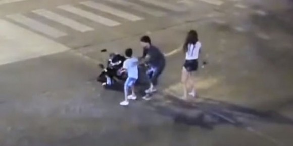 차량은 멈추고 주변 통행인들은 부상당한 남매를 돕기 위해 교차로로 몰려드는 모습이다.