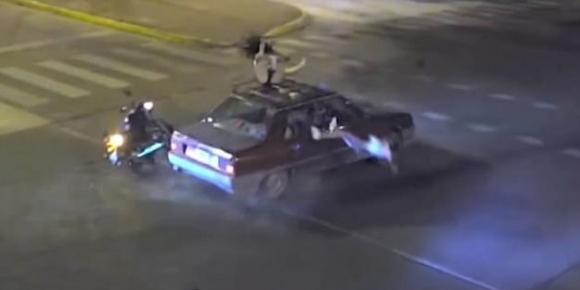 충돌 때문에 뒷자리에 타고 있던 동생은 공중에 뜬 후 도로에 부딪혔다. 그런데 오토바이를 몰던 누나는 차량 지붕 위에 안착한다.