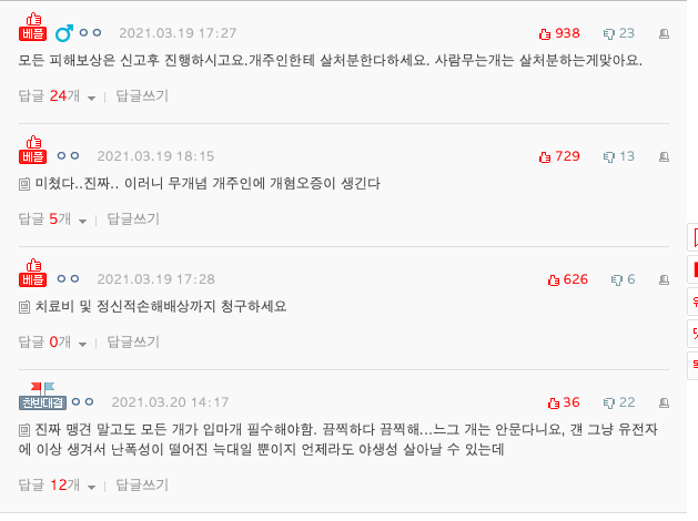 이를 접한 네티즌들은 “저런 개는 당장 안락사 시켜야한다”, “개 죽이고 주인 강력 처벌해야한다”, “아우.. 끔찍하다..” 등의 반응을 보였다.