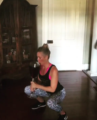 자세 하나를 취할 때마다 와인을 한 입씩 마시고, 스쿼트 자세를 더 오래 그리고 깊게 유지할 때는 와인을 조금 더 많이 마시면서 운동을 계속했다.