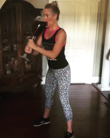 영상을 보면 메건은 자신의 얼굴보다도 큰 와인 잔을 든 채 스쿼트 운동을 하고 있다.