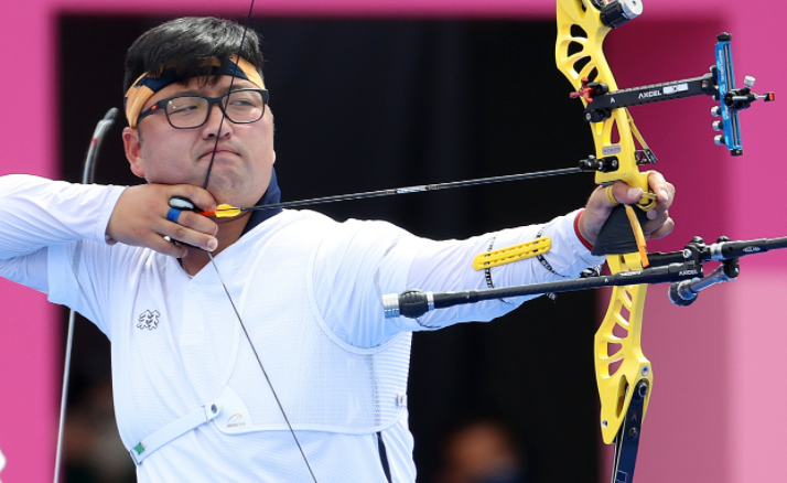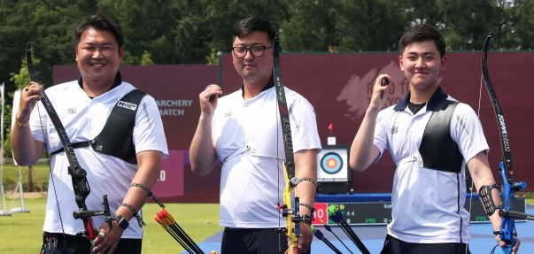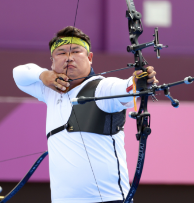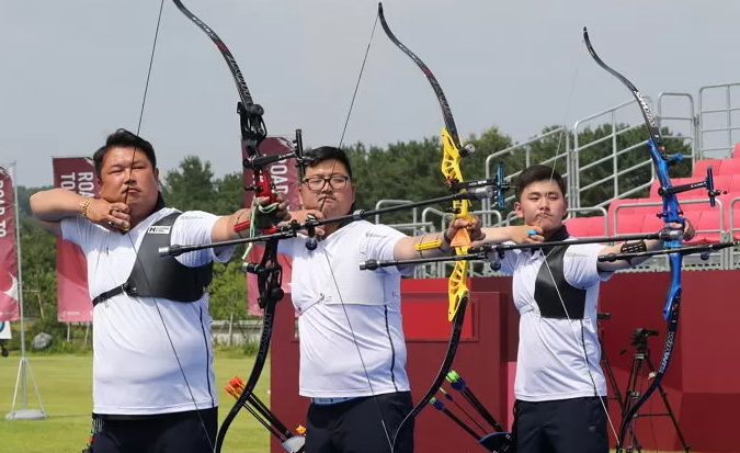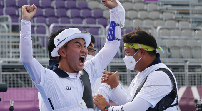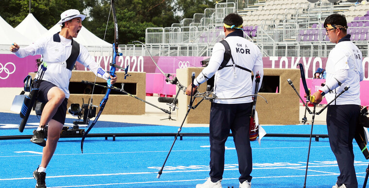 이날 오진혁(40), 김우진(29), 김제덕(17)으로 구성된 남자 양궁 대표팀은 위기에도 흔들리지 않았다.