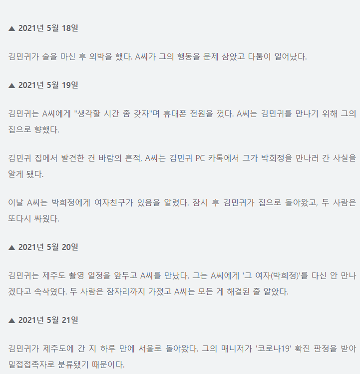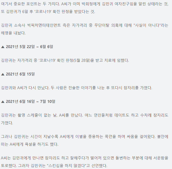 김민귀 소속사 측은 A씨를 두 번 죽였다. 빅픽처엔터테인먼트 관계자는 김민귀 자가격리 무단이탈 의혹에 대해 “사실이 아니다”라는 입장을 고수하고 있다.