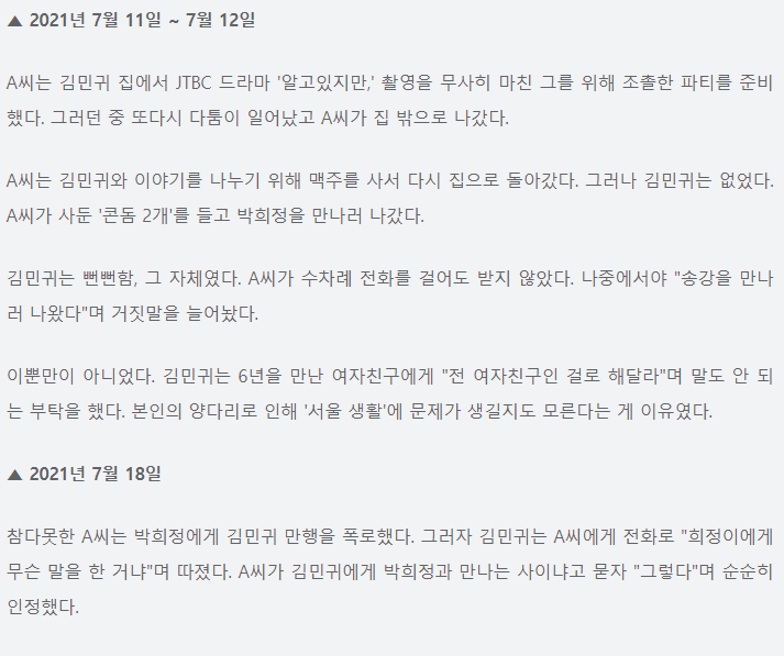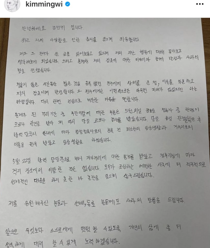 다만 김민귀는 자필 해명문에서 “A씨에게 미안하다”라며 사과의 뜻을 전했다.