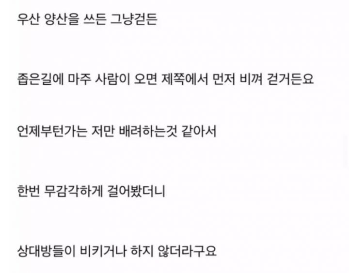 그리고 “우산 양산을 쓰든 그냥 걷든 좁은 길에 사람이 오면 제 쪽에서 먼저 비켜 걷는다”며 “언제부턴가 저만 배려하는 것 같아서 한 번 무감각하게 걸어봤더니 상대방들이 비키거나 하지 않았다”라고 전했다.