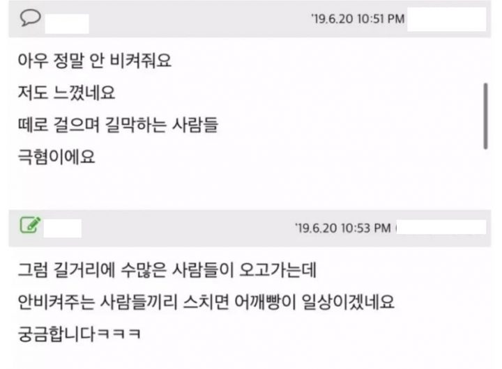 이를 본 누리꾼들은 “정말 안 비켜준다. 떼로 걸으며 길막하는 사람들 극혐이다”, “남자들이 차라리 서로 배려하며 길 비켜준다” 등 공감하는 반응을 나타냈다.