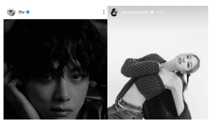 열애설이 나고 제니랑 뷔는 보란듯이 흑백으로 된 커플 사진을 동일 시간대에 올려 네티즌들의 시선이 모아졌다.