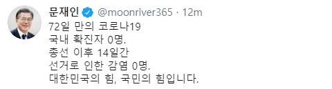 이날 문 대통령은 SNS를 통해 “72일 만의 코로나19 국내 확진자 0명. 총선 이후 14일간 선거로 인한 감염 0명. 대한민국의 힘, 국민의 힘입니다”라고 남겼다.
