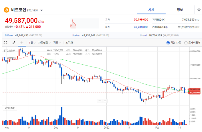 현재 비트코인은 업비트 거래소 기준 5,000만원 선이 붕괴돼 4,900만원에 거래되고 있는 추세다.