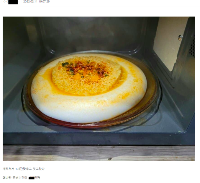 글 작성자는 “왜 나만 돈을 못 버는 건데”라 분노의 글을 작성하며 직접 육개장 컵라면을 전자레인지에 1시간 돌려버린 사진을 게시했다.