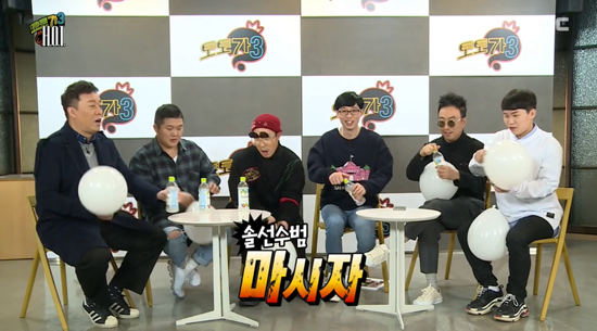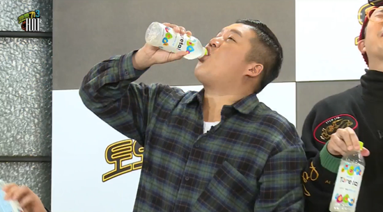박명수는 앞에 놓인 음료를 “마시자”고 들어올리며 PPL을 노출시켰다.