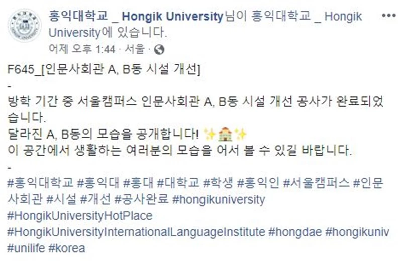홍익대학교 측은 지난 24일 공식 페이스북 페이지에 새롭게 단장한 서울캠퍼스 사진을 업로드했다.