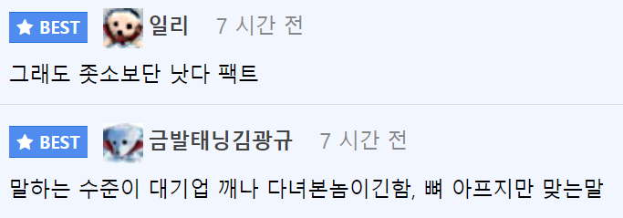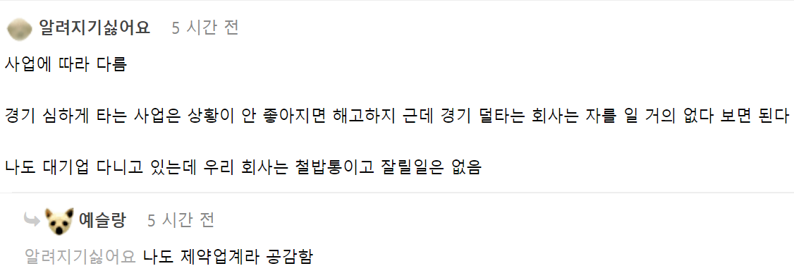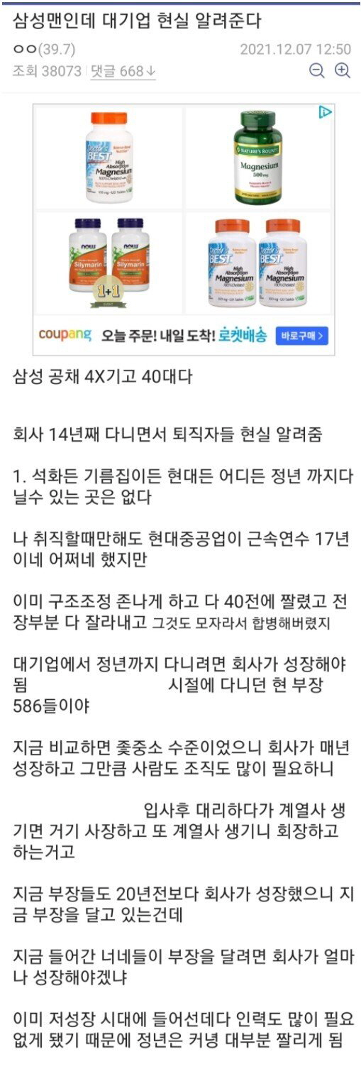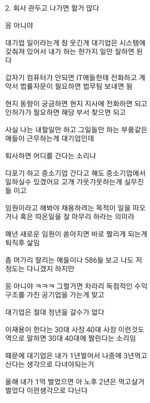 이어서 글쓴이는 “대기업이 마냥 좋은 줄 아시겠지만, 정년까지 근무를 계속할 수 있는 대기업은 없습니다. 30대 40대에 잘릴 수도 있는 겁니다.”라고 말을 덧붙였다.