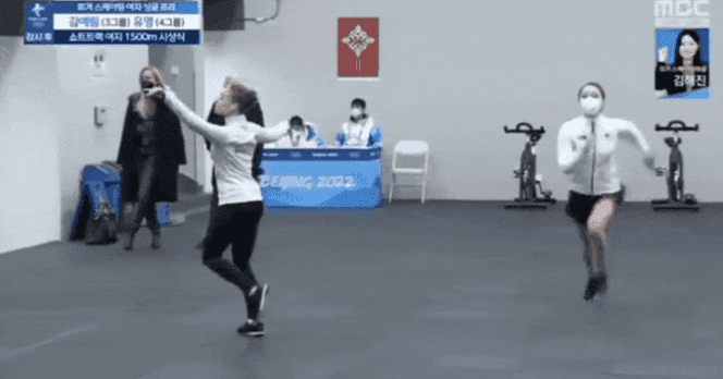 대기실에서는 출전을 앞두고 있는 피겨 선수들이 동작 연습을 하며 몸을 푸는 모습이 찍혔다.