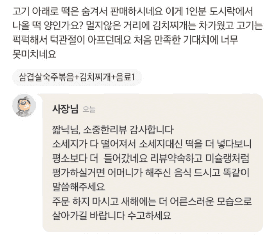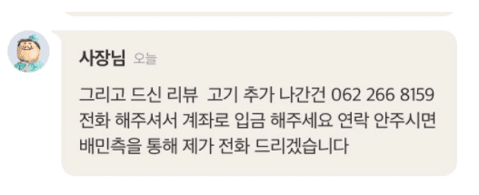 그러면서 “이제 주문하지말고 새해에는 어른스러운 모습으로 살아가라. 그리고 리뷰 고기 추가 나간 건 계좌로 입금해달라”라 손님에게 요구했다.