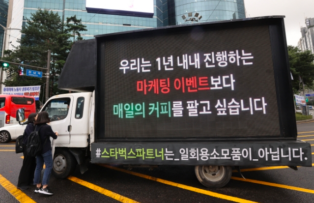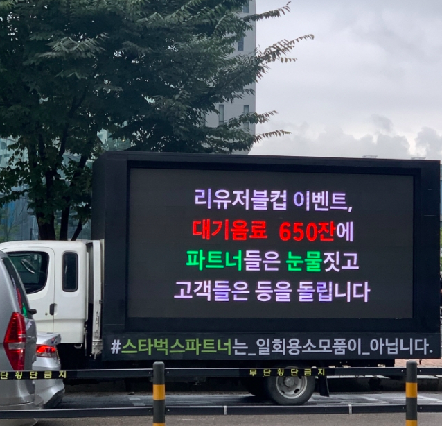 LED 전광판에 띄워진 스타벅스 파트너(현장 직원)들의 메시지가 시민들의 눈길을 끌었으며, 파트너들은 “과도한 판촉비용을 감축하고, 인사비용을 강화해 인력난을 개선해달라“고 호소했다.