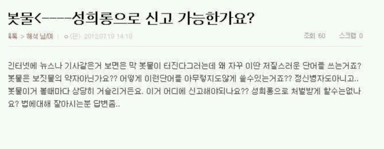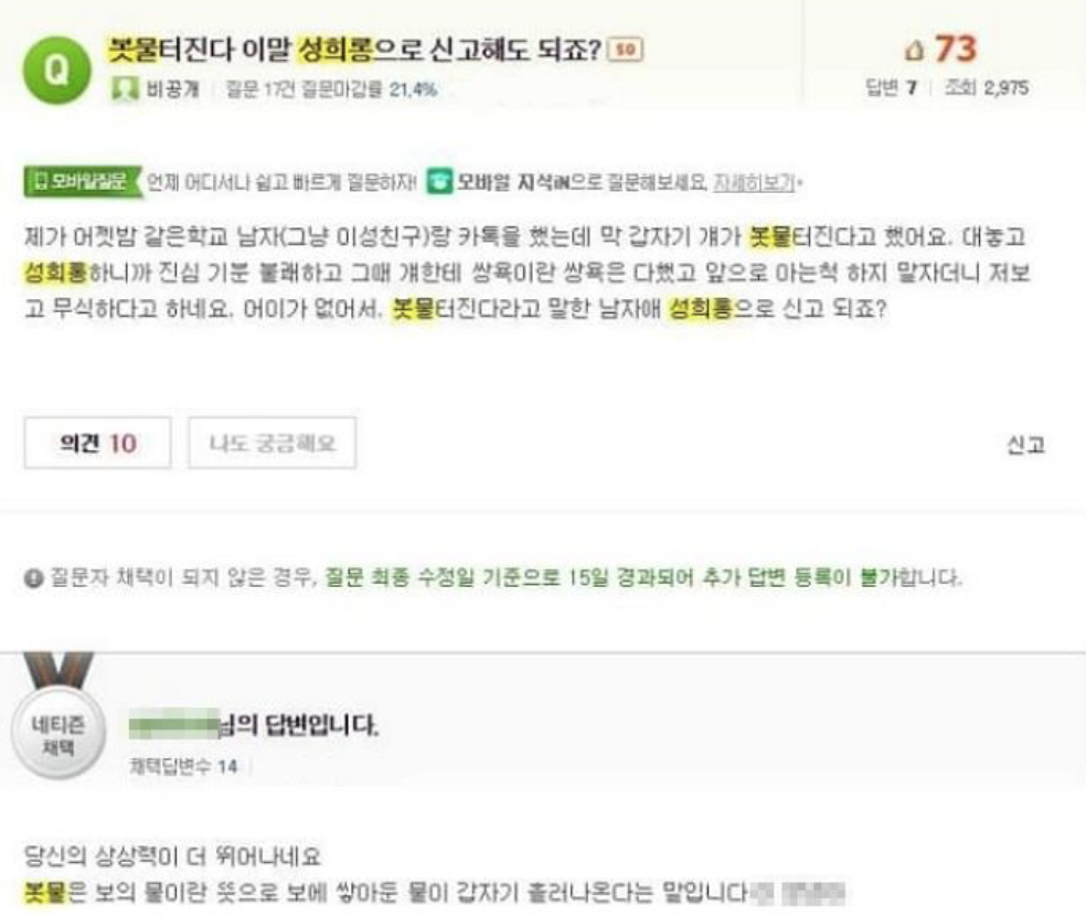 하지만 오래 전 네이버 지식인에는 ‘봇물터진다는 말 성희롱으로 신고해도 되죠?’라는 제목의 글이 올라왔다.