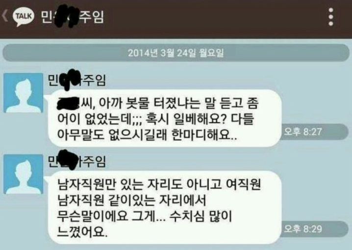 한 여직원은 ‘봇물 터진다’고 말한 남자 직원에게 “아까 봇물 터졌냐는 말 듣고 좀 어이 없었는데 혹시 일베하냐”라고 물으며 “수치심을 많이 느꼈다”고 말했다.