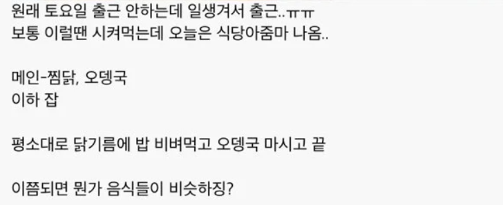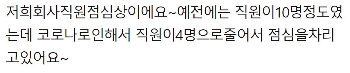 A씨는 “저희회사직원점심상이에요~” 라고 전했다.