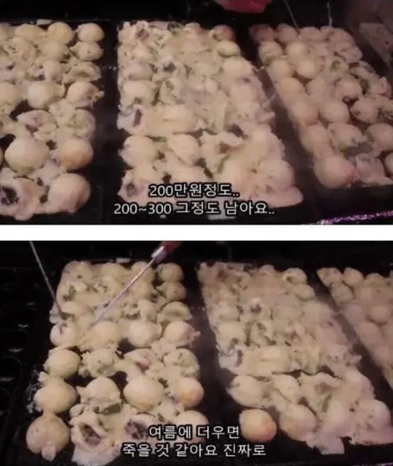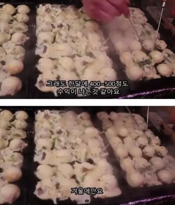 시즌상 가장 장사가 잘되는 겨울철에는 400~500만원정도의 수익이 나고 장사가 잘안되는 여름 시즌에는 200~00만원정도 남는다며 “여름에 더우면 죽을것 같다”는 고충을 덧붙였다.