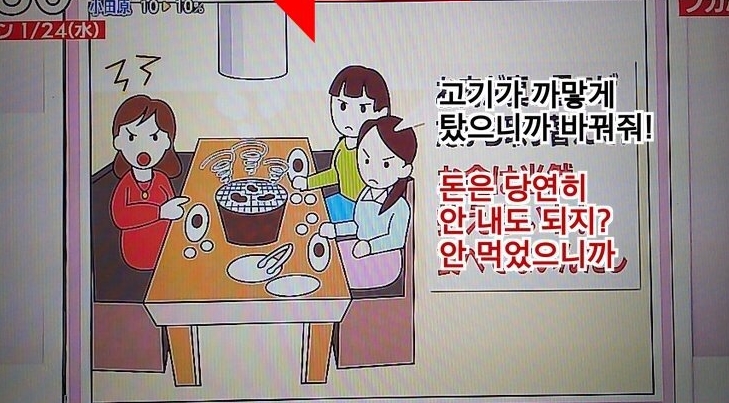 “고기가 까맣게 탔으니까 바꿔줘! 돈은 당연히 안 내도 되지? 안 먹었으니까.”