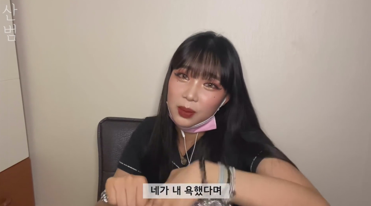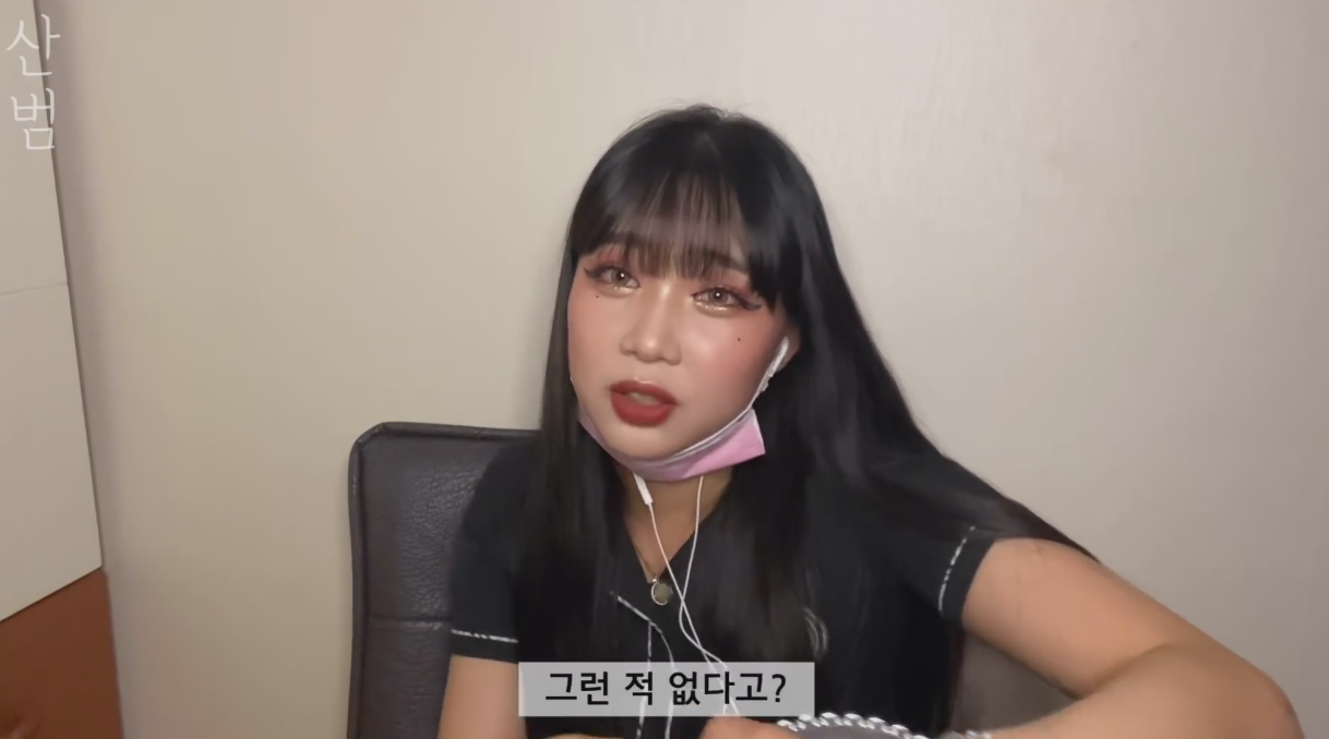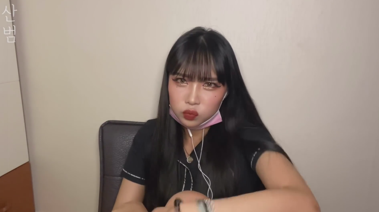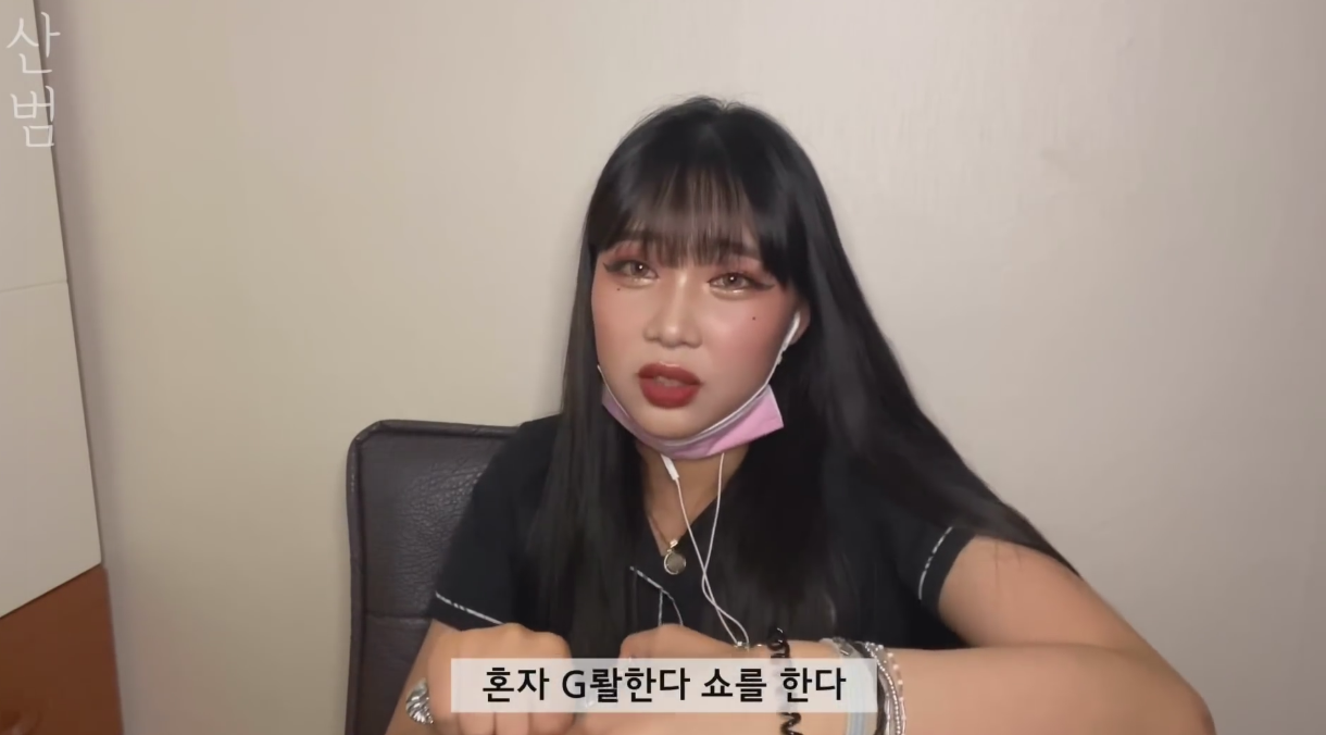 해당 영상에서 산범은 분홍색 마스크를 턱까지 살짝 내리고 비트에 맞춰서 랩을 한다.