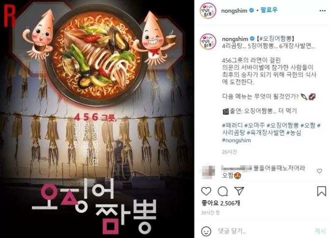 이들은 “물 들어올 때 노 젓는 농심”, “센스 대박이다”, “농심도 오징어게임에 푹 빠졌다”, “아이디어가 어마어마하다”, “오짬식 마케팅”, “기회를 놓치지 않는다” 등의 반응을 보였다.