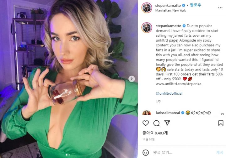 스테파니는 자신의 SNS에 글을 올려 “대중들의 수요 때문에 방귀를 담은 병을 팔기로 결정했다”며 “한 미디어 플랫폼에서 10일 동안만 구매할 수 있다”고 전했다.