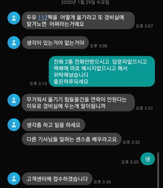 고객 B씨는 “두유 112팩을 어떻게 옮기라고 또 경비실에 맡겨 놓으면 어쩌냐. 생각이 있는 거야 없는 거야”라고 닥달했다.