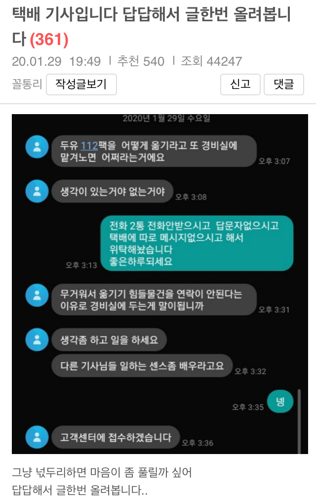 택배 기사 A씨는 “그냥 넋두리하면 마음이 좀 풀릴까 싶어 답답해서 글 한번 올려본다”고 말을 시작했다.