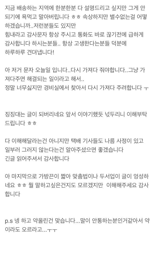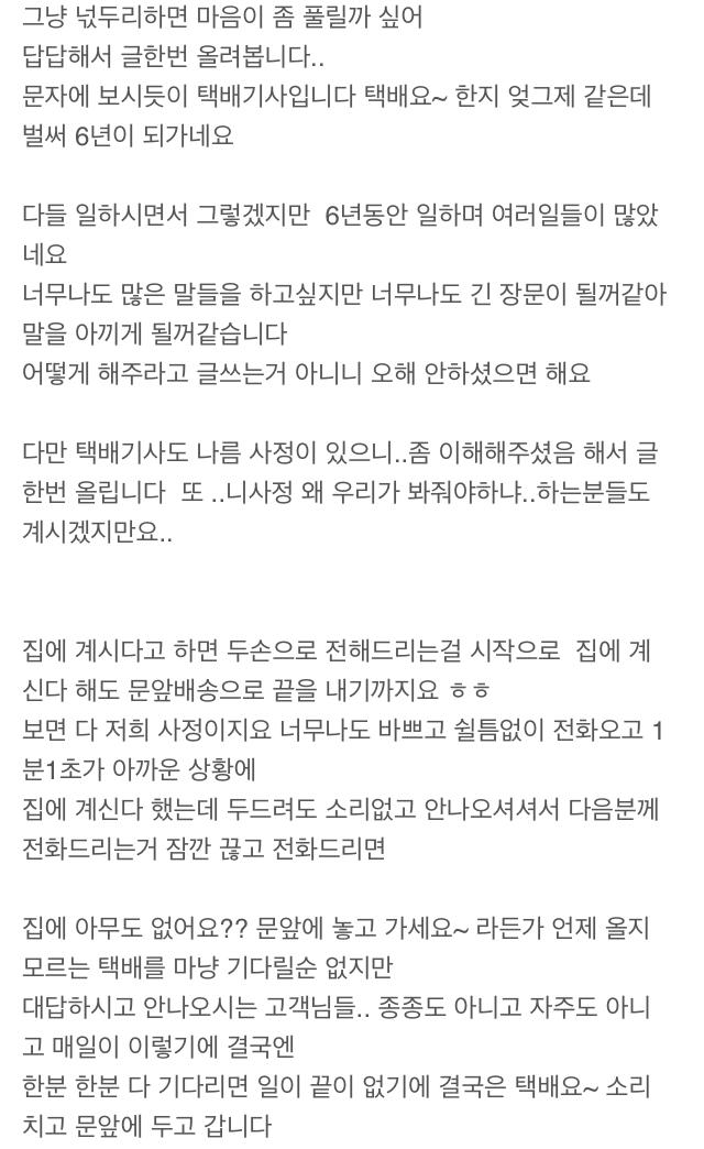 이어 “택배 기사 일을 한지 벌써 6년이 되간다. 다들 일하시면서 그렇지만 6년동안 많은 일이 있었다. 어떻게 해달라고 글을 쓰는 거 아니고, 다만 택배 기사도 나름 사정이 있으니 이해해주셨으면 해서 글을 올린다”고 덧붙였다.