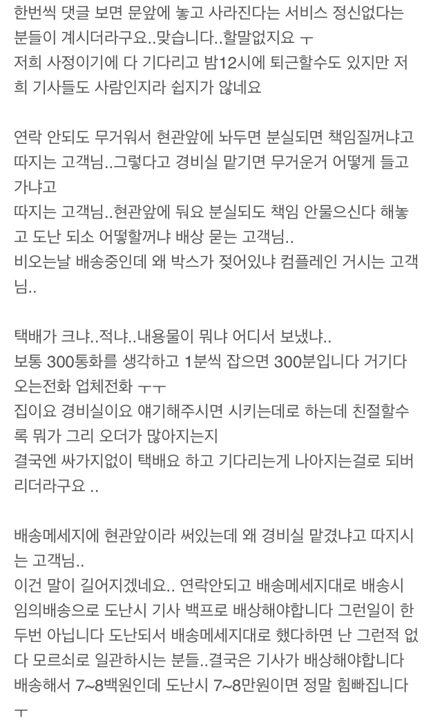 택배 기사 A씨는 “연락 안되도 무거워서 현관 앞에 놔두면 분실되면 책임지냐고 따지는 고객님… 그렇다고 경비실에 맡기면 무거운 거 어떻게 들고 가냐고 따지는 고객님”이라고 한탄했다.