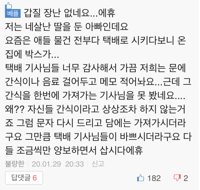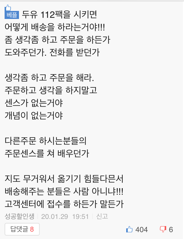 “두유 112팩을 어떻게 옮기라고 또 경비실에 맡겨노면 어쩌라는 거예요”