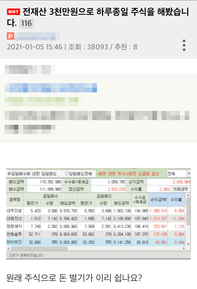 5일 한 온라인 커뮤니티엔 ‘전재산 3천만원으로 하루종일 주식을 해봤습니다’라는 제목의 글이 올라왔다.