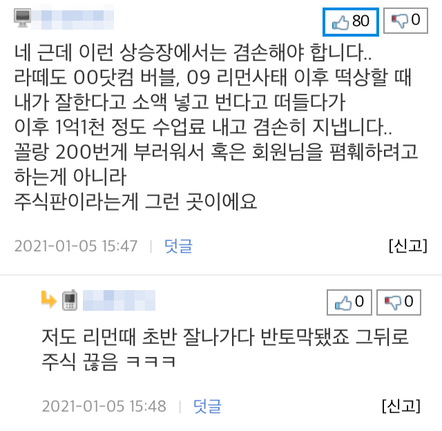 특히 어느 누리꾼은 “그런데 이런 상승장에서는 겸손해야 한다. 저도 00닷컴 버블, 09 리먼사태 이후 떡상할 때 제가 잘한다고 소액 넣고 번다고 떠들다가 이후 1억1천 정도 수업료를 내고 겸손히 지낸다. 주식판이란 그런 곳이다”고 조언했다.