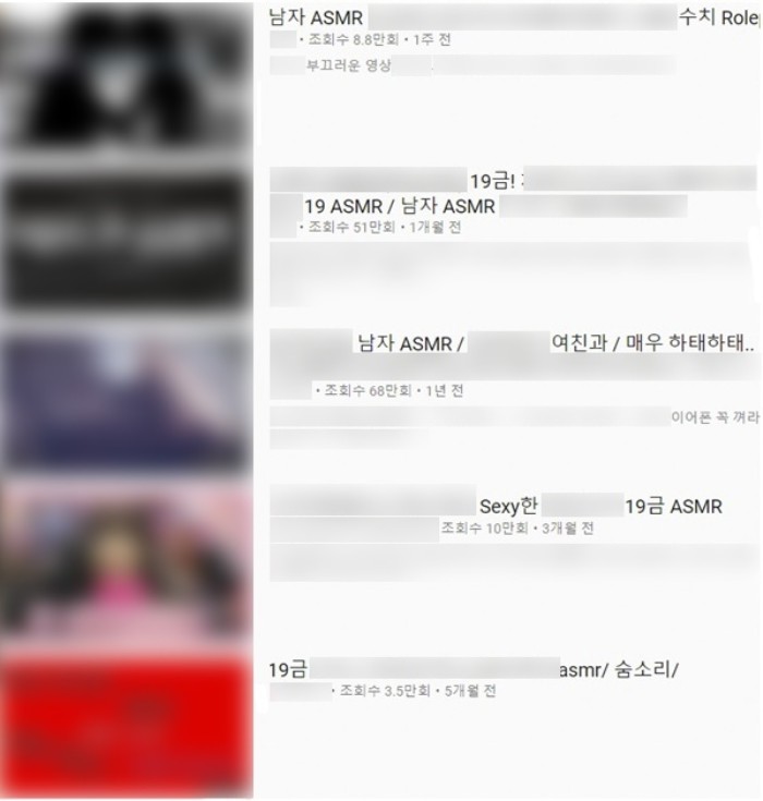 실제로 유튜브에서 ’19금 ASMR’을 검색해보면 자극적인 제목의 영상들이 끝없이 이어져 나온다.