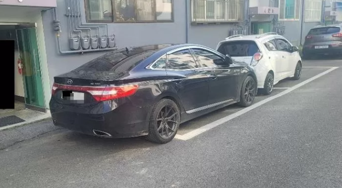 공개된 사진에는 A씨의 그랜저가 2칸 주차를 한 스파크 뒤에 바짝 붙어 주차가 된 상태이며, 이대로라면 늦은 오후 SM5가 오더라도 주차가 불가능하다.