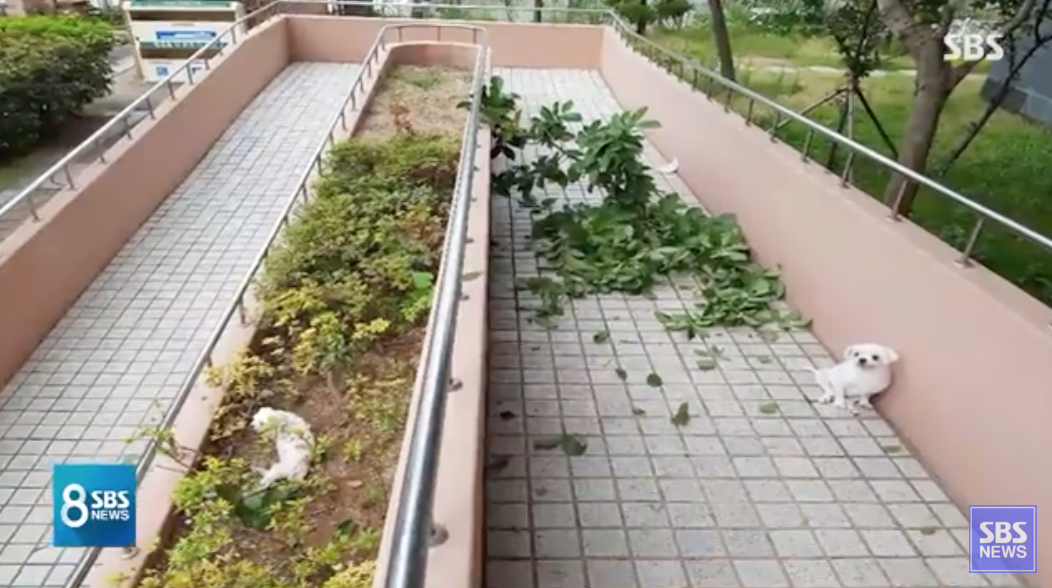 강아지 두 마리는 나무에 부딪힌 뒤 화단으로 떨어졌다. 나무에 부딪히면서 충격이 완화돼 다행히 죽지는 않았지만 심하게 다쳐 치료를 받고 있는 것으로 전해졌다.