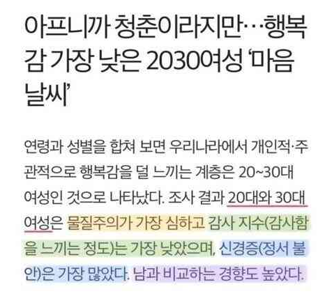 2030여성이 가장 불행느꼈는데 그 원인으로