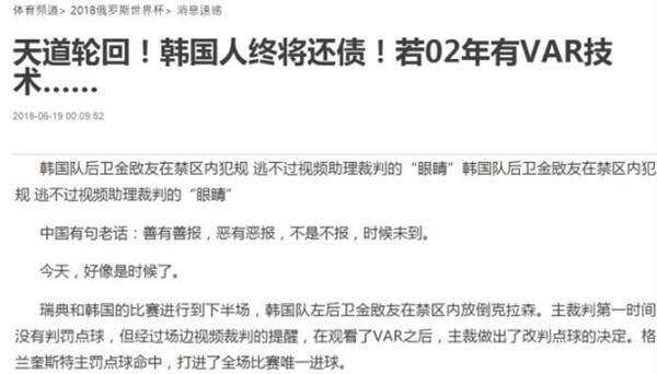 경기가 끝난 후 한국VS스웨덴전을 본 중국과 일본 네티즌들은 “인과응보! 한국은 지난 2002년 한·일 월드컵 16강 이탈리아전에서의 오심에 대한 벌을 받은 것”이라며 비난했다.