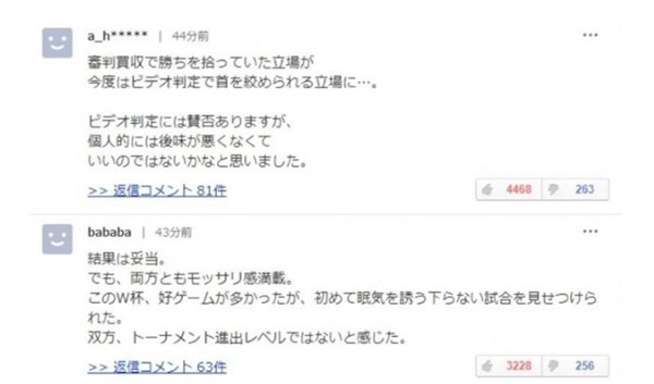 일본 네티즌들도 “심판 매수로 승리를 줍더니 이번에는 비디오 판정으로 목을 졸리는 입장이 되었구나”라며 “결과는 타당했다”고 이번 월드컵 첫경기에서 한국의 패배를 조롱했다.