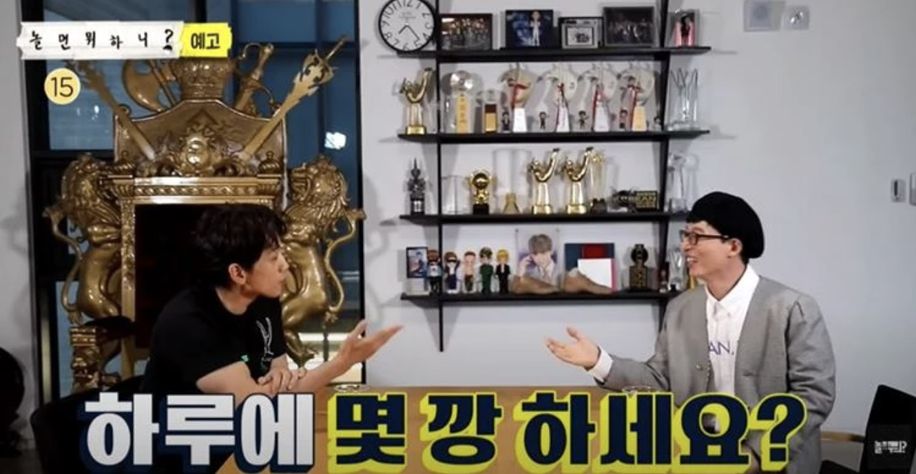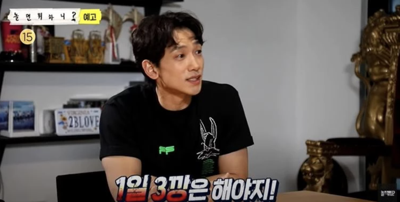 해당 영상에서 유재석은 비에게 “하루에 몇 깡 하시냐”고 물었다. 이에 비는 “아침 먹고 깡, 점심 먹고 깡, 저녁 먹고 깡한다. 1일 3깡은 해야지”라며 일명 ‘깡부심’을 부려 폭소를 자아내기도 했다.
