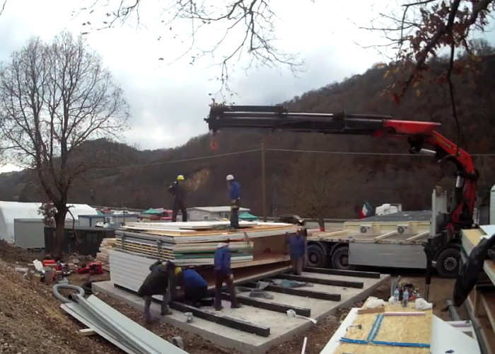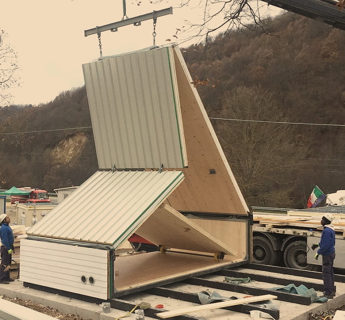 3단으로 접힌 미리 제작되어 있는 모듈을 중장비로 들어 올리자 순식간에 지붕이 만들어진다.