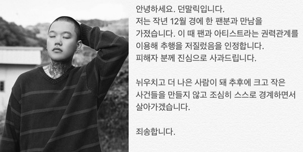 그리고 지난달 22일 던말릭은 인스타그램을 통해 “팬과 아티스트라는 권력관계를 이용해 추행을 저질렀음을 인정한다. 피해자분께 진심으로 사과드린다”는 사과문을 올린 바 있다.