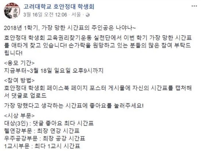 고려대 학생회 페이스북 페이지에 자신의 시간표를 캡처해 올리면 응모가 되는 방식으로 대상은 가장 많은 좋아요를 받은 학생에게 돌아갔다.