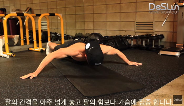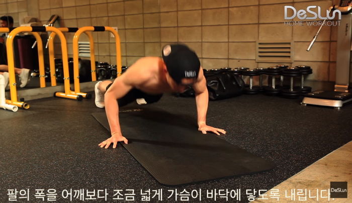 평상시에 하는 팔굽혀펴기 동작보다 팔의 폭을 어깨보다 조금 넓게 벌린 다음 가슴이 바닥에 닿도록 내린다.