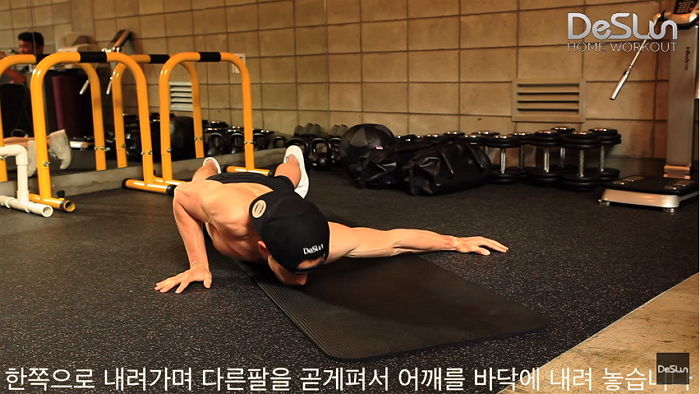 여덟 번째는 양팔을 좌우로 번갈아 가며 앞뒤로 옮기는 팔굽혀펴기 동작이다.