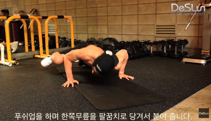 세 번째는 무릎과 팔꿈치를 붙이는 동작이다. 팔굽혀펴기를 하면서 한쪽 무릎을 팔꿈치까지 당겨서 붙여준다.